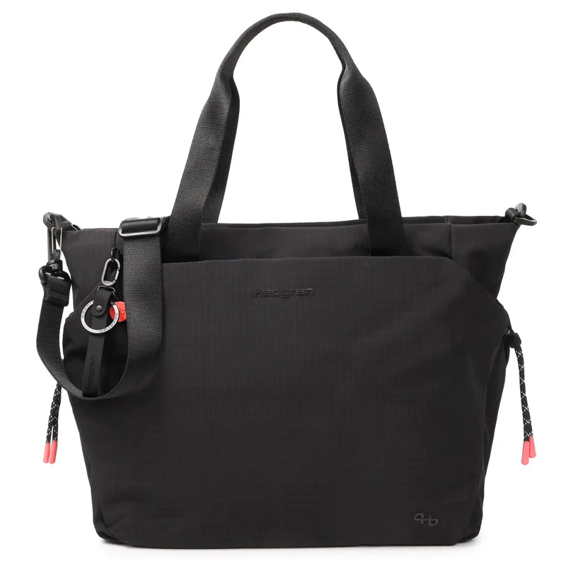 Satoshi might look like your average tote bag, with stylish colour blocking and colour contrasting details, but it is anything but ordinary! Like all the bags in the String Collection, it has an adjustability function, allowing you to get even more of your essentials in the bag, perfect for travelling. Other great travel features include the smart sleeve that hooks over your suitcase handle and integrated safety pocket for your passport and boarding pass. It also has lockable zippers, so you know everything inside is safe from intruders. The long carry handles and detachable shoulder strap give you carry options, while the 14" laptop sleeve means you can work on the go. There's space for your A4 files, phone, water bottle, umbrella and even a key fob. And the partially recycled exterior material used to make the bag is soft and water-repellent. Rubber details and metal hardware finish this bag off in the perfect Hedgren style.