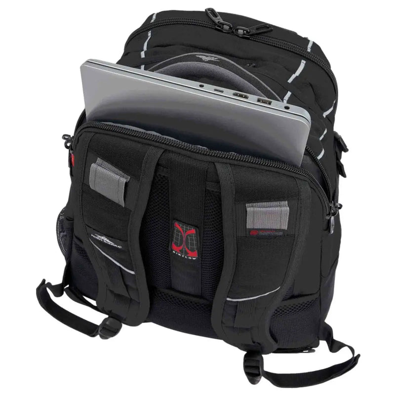 • Padded Airflowβ„’ back panel with suspension backpack straps for ergonomic comfort