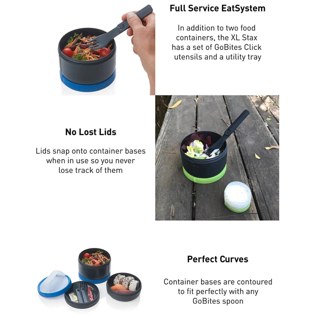 Introducing the first modular storage system designed for humans — humangear Stax. Humangear Stax is a modular system of watertight stacking containers that click together with a simple, quick 180-degree twist for effortless organisation. Each container features its own leak-tight lid, and there’s a removable ClipHandle on top. Take one, take a bunch — it’s your stuff, take what you want. The EatSystem is great for taking your lunch to the office, going on a picnic, or just having a convenient on-the-go system for enjoying your breakfast, lunch, or dinner wherever you might be. The set comes with a set of GoBites Click utensils (fork and spoon). This set of utensils telescopes out to form comfortable utensils for everyday use but also slides down into easy-to-store utensils. This set fits in the special utility tray included in the set. This tray is also great for sauce packets, napkins, or any other small items you might need. The set also comes with the standard ClipHandle that allows for easy carrying and attaching your stacking set of containers onto the outside of a backpack or bag. We’ve also included two containers in this set—this way you can keep, say, your salad separate from your soup. Finally, the containers are rounded at the bases in the same shape as a GoBites spoon for easy scraping.