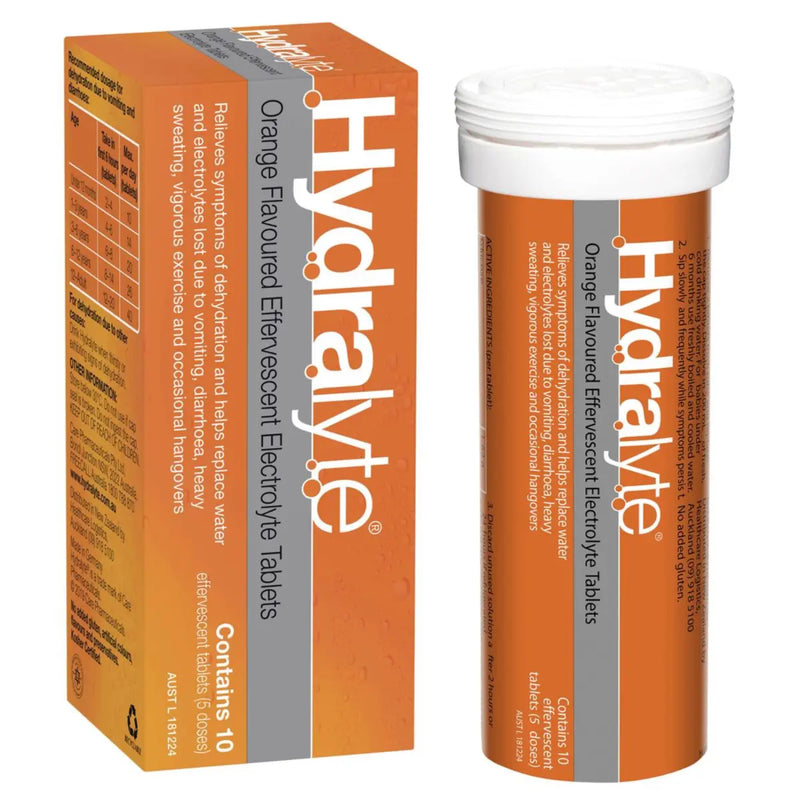 Hydralyte Effervescent Electrolyte Tablets Orange Flavoured relieves symptoms of dehydration and helps replace water and electrolytes lost due to vomiting, diarrhoea, heavy sweating, vigorous exercise and occasional hangovers.